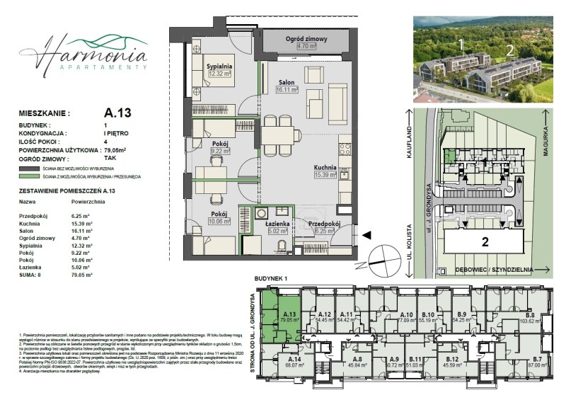 Oferowany lokal mieszkalny nr A.13 o pow. 79,05 mkw., oraz wystawą okien w kierunku północno-wschodnim, zlokalizowany jest na pierwszym piętrze budynku nr 1.