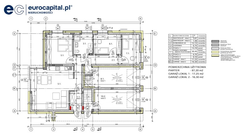 - Budynek "A" – powierzchnia lokal 1, parter – ok. 85,72 m2 + garaż 17,25 m2 + ogródek, powierzchnia lokal 2, piętro – ok. 118 m2 + garaż 16,30 m2