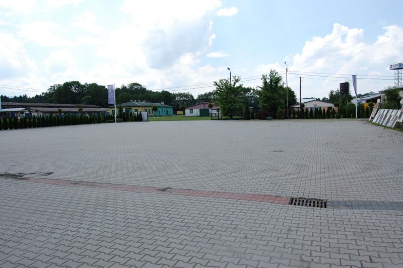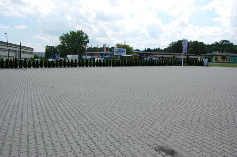 - Zagospodarowanie: Cały teren utwardzony; od frontu parking / duży plac manewrowy wyłożony kostką brukową (pow. ok. 22 a, wymiary: 42x53 m), z tyłu drogi komunikacji wewnętrznej: asfalt;