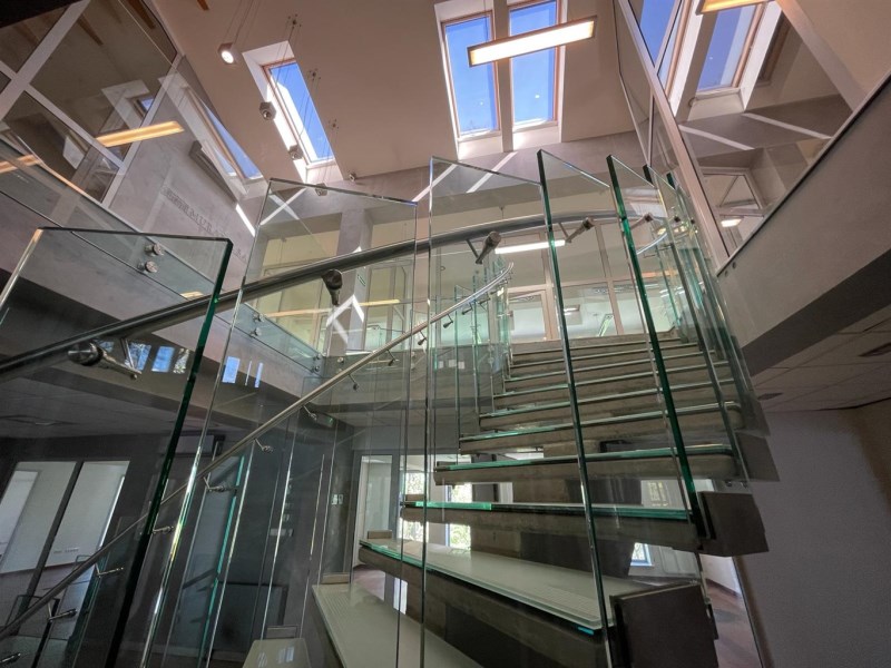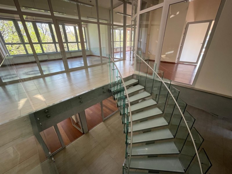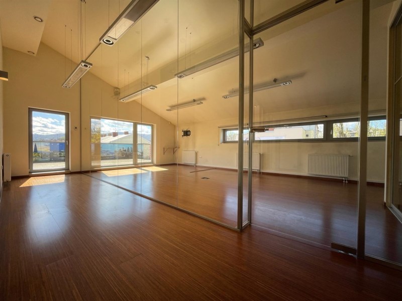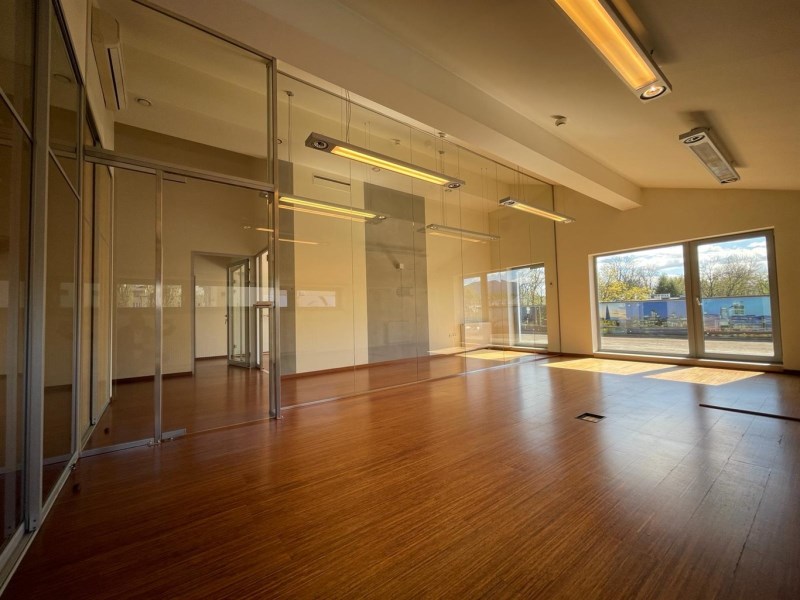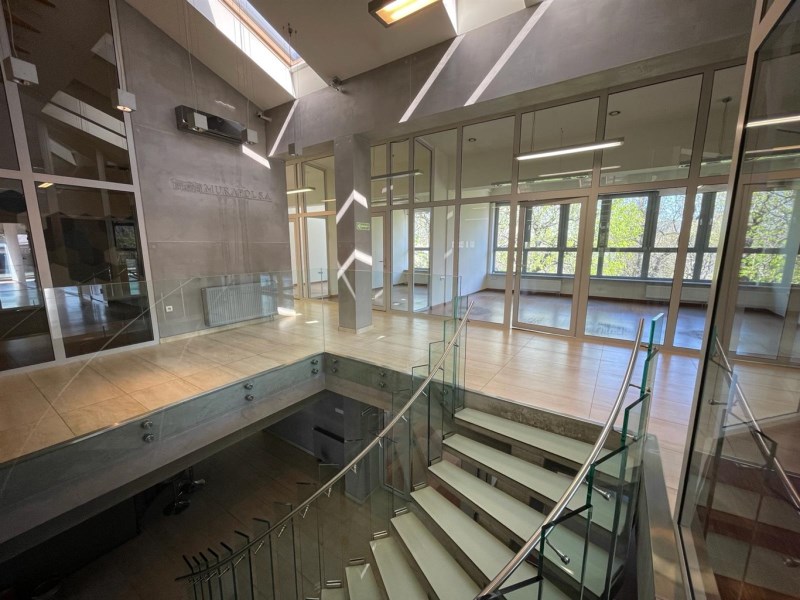 Lokal zajmuje drugie i trzecie piętro w czterokondygnacyjnym nowoczesnym budynku przy ul. Partyzantów. Wnętrze lokalu zostało zaprojektowane z myślą o funkcjonalności i komforcie pracy. Przestrzeń została podzielona szkłem, a obie kondygnacje łączą efektowne szklane schody. Przeszklone pomieszczenia dedykowane pod biura, sale konferencyjne - zarówno mniejsze jak i większe, sala rekreacyjna, taras. Dodatkowo dla wygody użytkowników lokal wyposażony jest w dwie kuchnie oraz elegancko wykończone toalety na obu piętrach, a także w serwerownię. Przestrzeń, która inspiruje do pracy! Przeszklenia pomieszczeń łączą nowoczesny design z przestronnością. Lokal pomimo upływu czasu, nadal robi duże wrażenie!