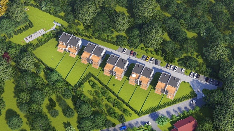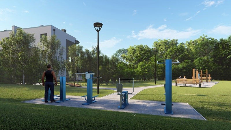 Możliwość wybudowania 5 budynków z miejscami postojowymi zewnętrznymi. Dodatkowo projekt uwzględnia lokalizację na terenie inwestycji siłowni na świeżym powietrzu.