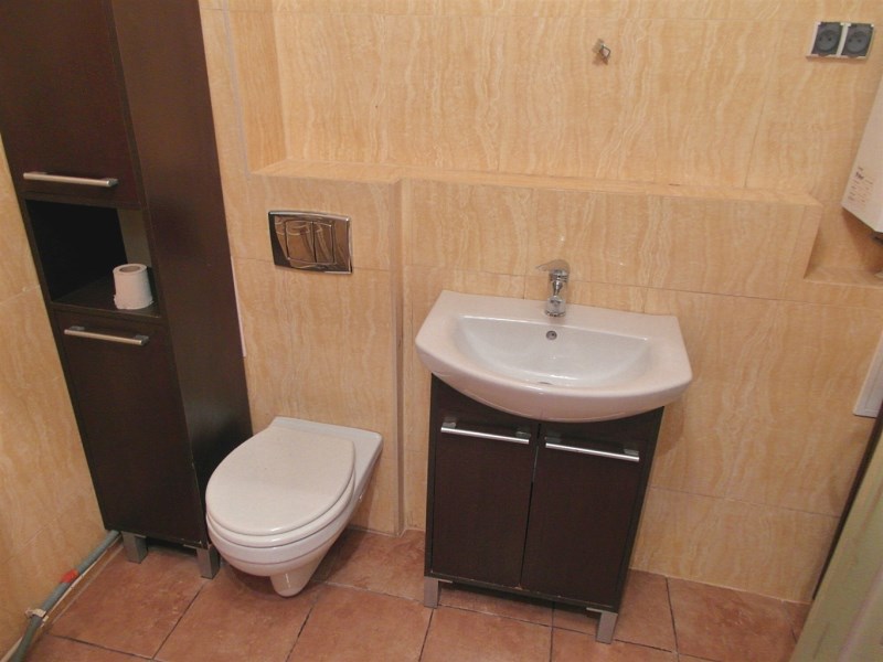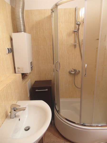 - łazienka z wc - kafelki, umywalka, kabina prysznicowa, wc, ciepła woda z łazienkowego piecyka gazowego.