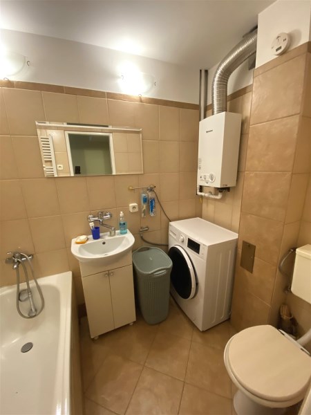 - łazienka z wc - kafelki, wanna, umywalka w zabudowie, wc, pralka, łazienkowy piecyk gazowy,