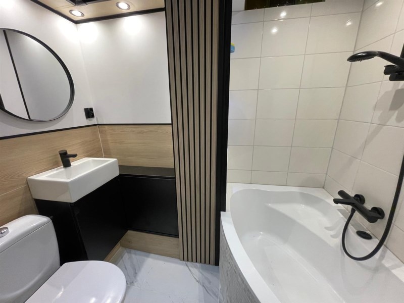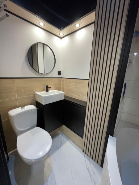 - salon z aneksem kuchennym, sypialnia, pokój, łazienka z wanną i WC, przedpokój