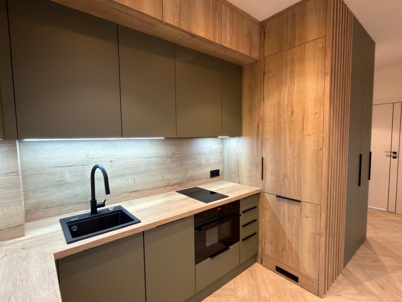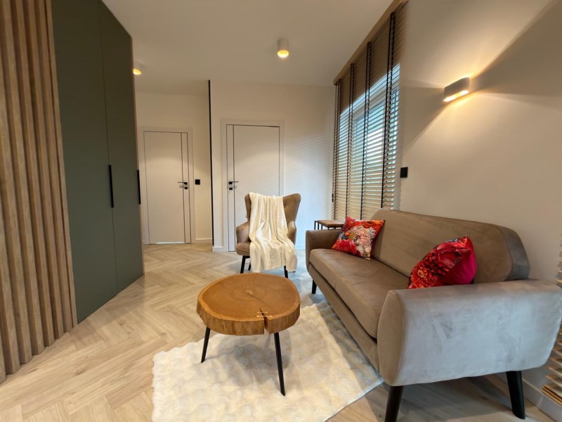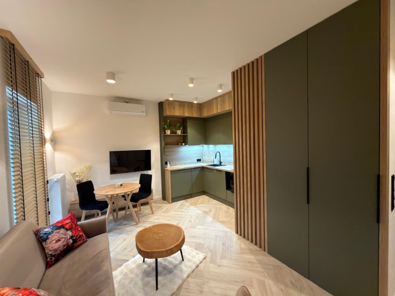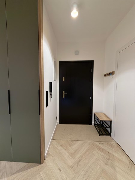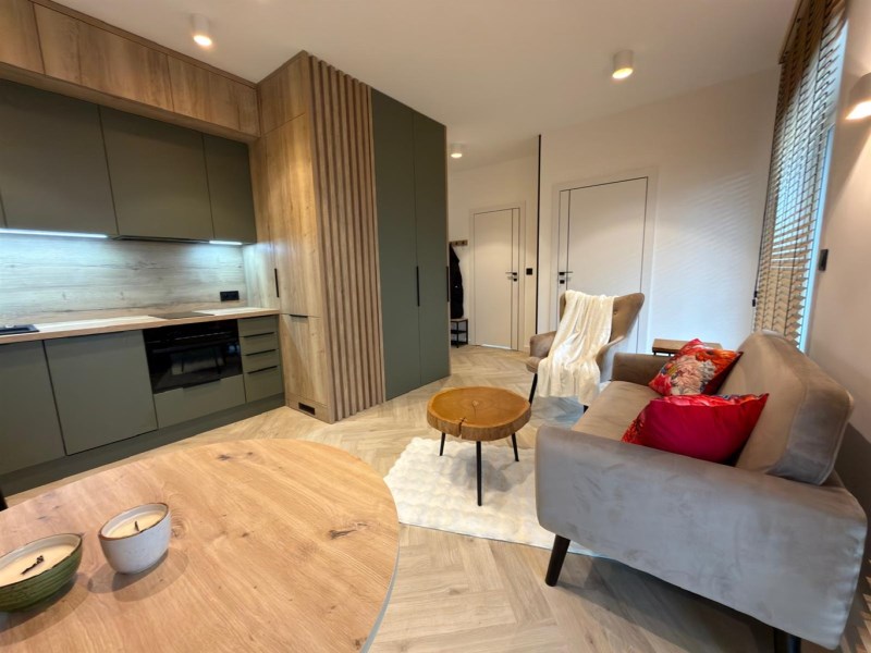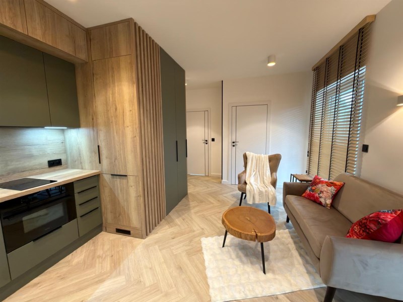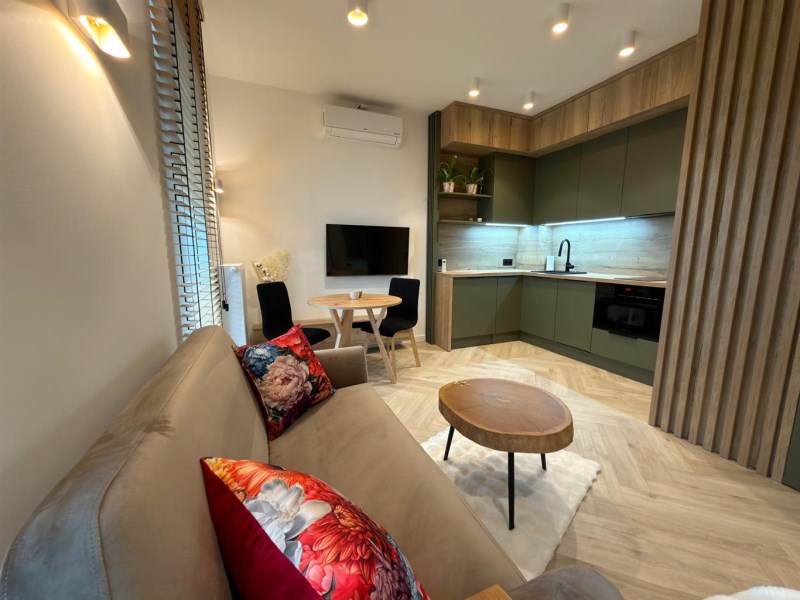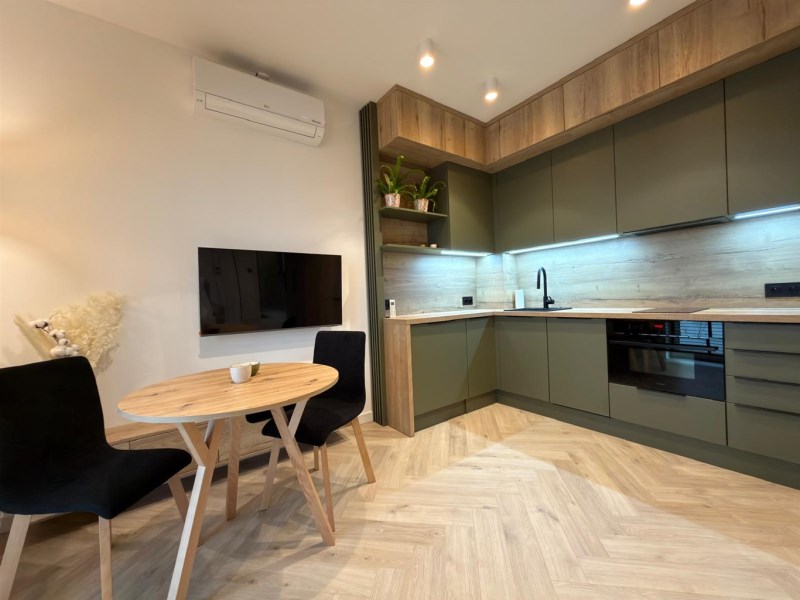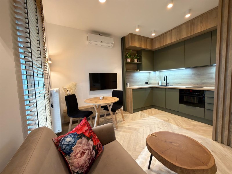 Wnętrze zostało wykończone w wysokim standardzie, w spójnym, nowoczesnym stylu, z dbałością o każdy detal. Kuchnia została wykonana na wymiar przez stolarza i wyposażona w wysokiej jakości sprzęt AGD. Salon z aneksem kuchennym tworzy funkcjonalną i komfortową przestrzeń do codziennego życia, a osobny pokój zapewnia prywatność i wygodę. Mieszkanie jest w pełni umeblowane i wyposażone, między innymi w klimatyzację z funkcją oczyszczania powietrza, nowoczesną łazienkę, wysokiej klasy sprzęty RTV i AGD oraz praktyczne rozwiązania podnoszące komfort użytkowania.
