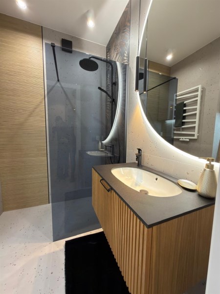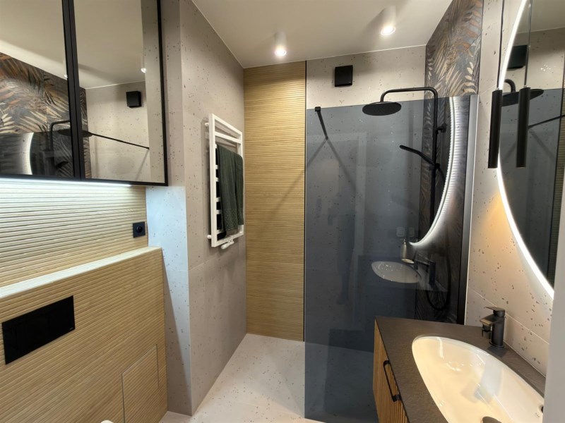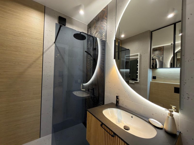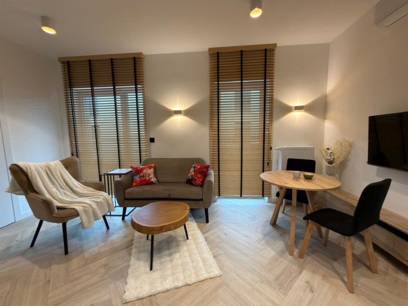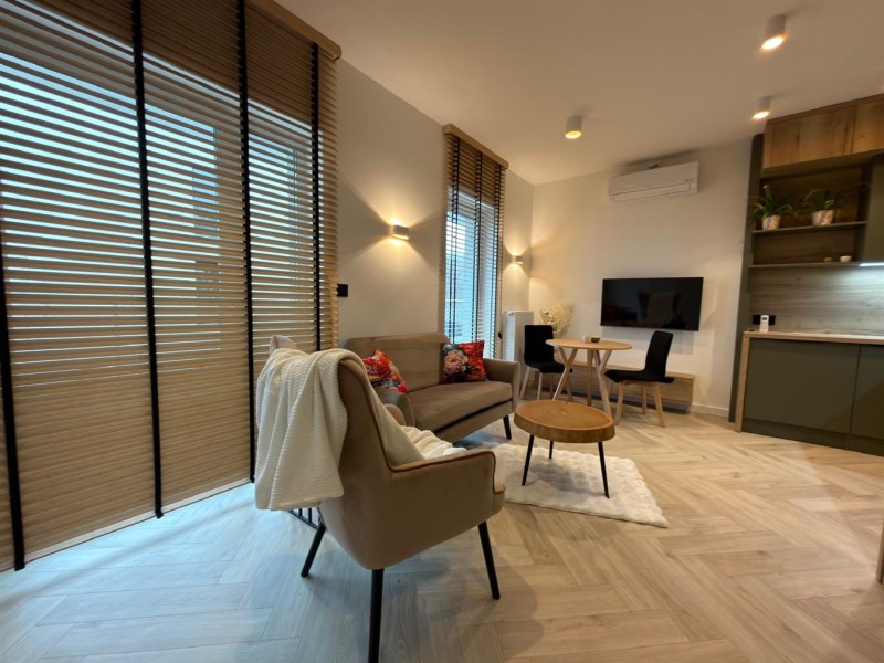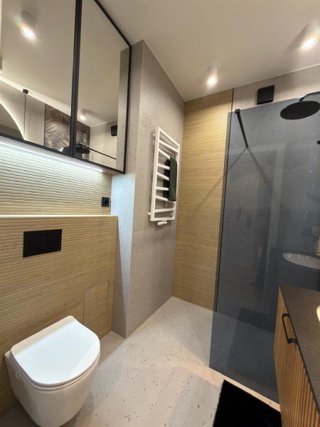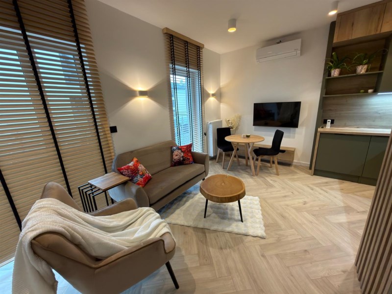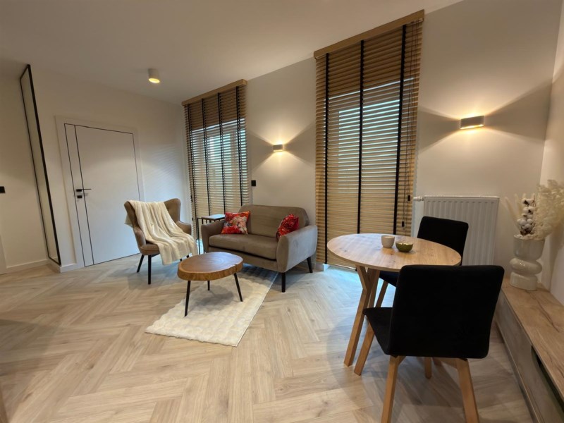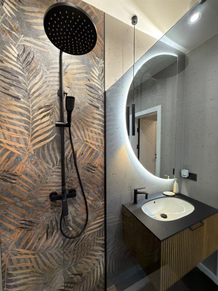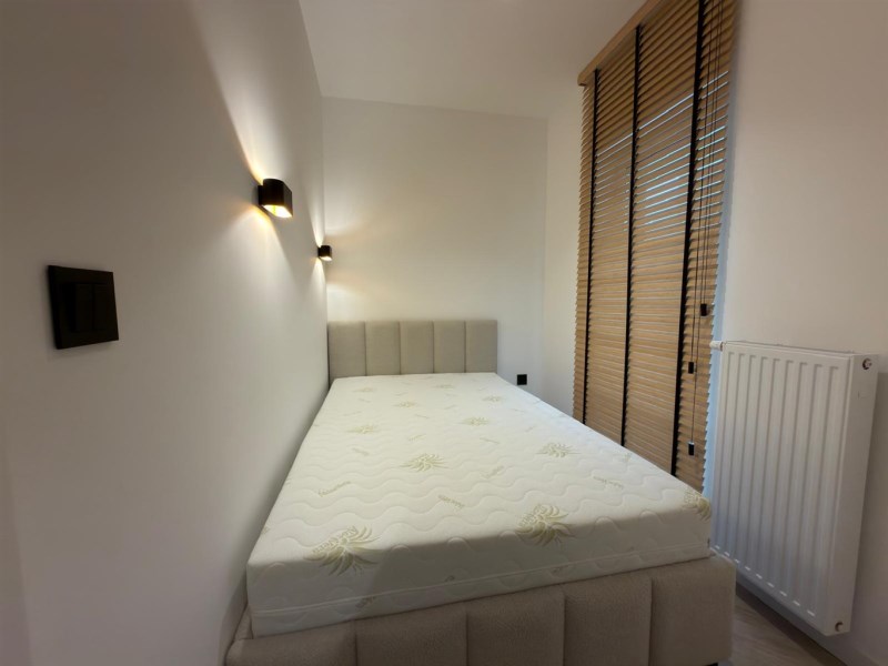 Wnętrze zostało wykończone w wysokim standardzie, w spójnym, nowoczesnym stylu, z dbałością o każdy detal. Kuchnia została wykonana na wymiar przez stolarza i wyposażona w wysokiej jakości sprzęt AGD. Salon z aneksem kuchennym tworzy funkcjonalną i komfortową przestrzeń do codziennego życia, a osobny pokój zapewnia prywatność i wygodę. Mieszkanie jest w pełni umeblowane i wyposażone, między innymi w klimatyzację z funkcją oczyszczania powietrza, nowoczesną łazienkę, wysokiej klasy sprzęty RTV i AGD oraz praktyczne rozwiązania podnoszące komfort użytkowania.