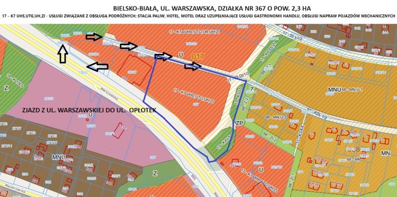Teren o pow. ok 1,45 ha: 17 – K7 UHS,UTG,UH,ZI – docelowe przeznaczenie – usługi związane z obsługą podróżnych; stacja paliw, hotel, motel oraz uzupełniające usługi gastronomii handlu, obsługi napraw pojazdów mechanicznych.