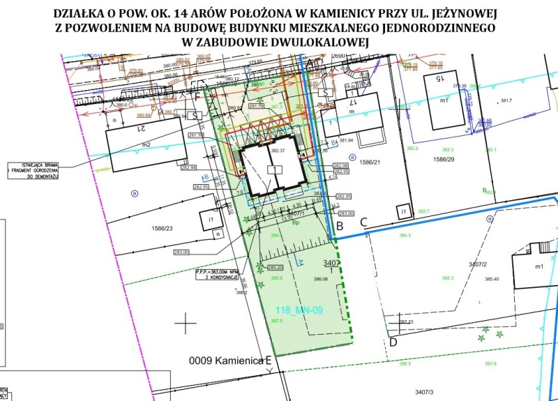 ATRAKCYJNA DZIAŁKA BUDOWLANA OZNACZONA NUMEREM „A”, O POW. OK. 14 ARÓW Z POZWOLENIEM NA BUDOWĘ BUDYNKU JEDNORODZINNEGO W ZABUDOWIE DWULOKALOWEJ oraz PROJEKTEM SIECI, POŁOŻONA W ZIELONEJ DZIELNICY MIASTA BIELSKA-BIAŁEJ – KAMIENICY PRZY UL. JEŻYNOWEJ.