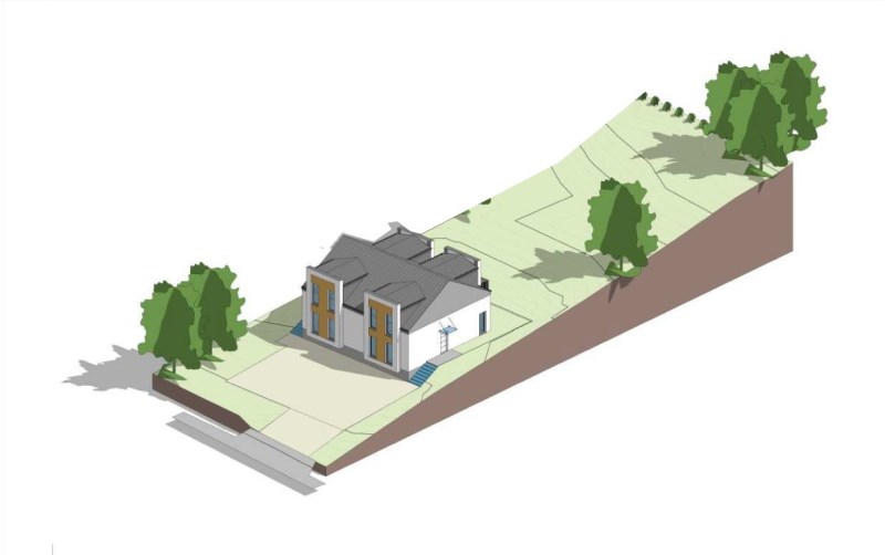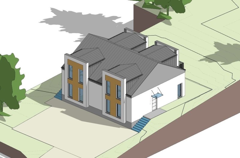 DZIAŁKA A: pow. ok. 0,1392 ha, cena 450,00 zł brutto/1 mkw. (w tym VAT) – projekt budynku jednorodzinnego w zabudowie dwulokalowej wg. indywidualnego projektu pracowni ARCHIKOS