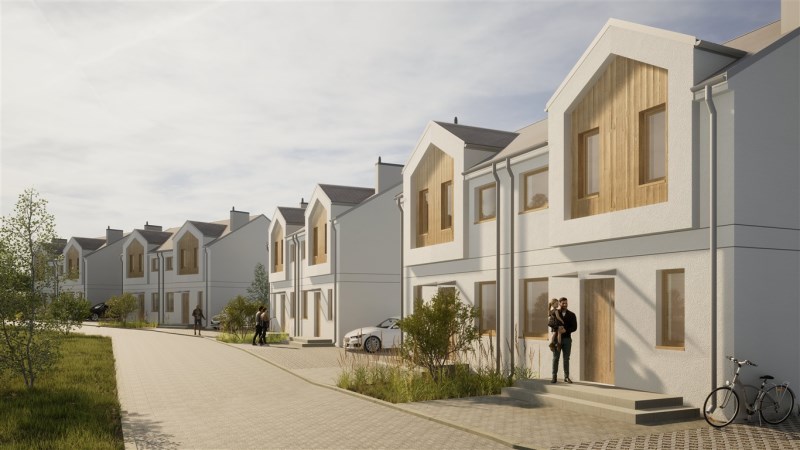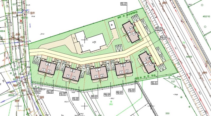 - Teren poszczególnych budynków ogrodzony z trzech stron, (bez ogrodzenia od strony frontowej budynków, bez bramki oraz bramy wjazdowej) – ogrodzenie istniejące lub nowe metalowe siatkowe bez podmurówki.