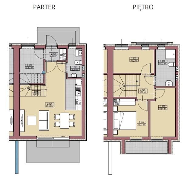 Projektowany budynek składa się z dwóch niezależnych lokali mieszkalnych. W skład każdego wchodzi część dzienna na parterze (salon z kuchnią z wyjściem na taras, wiatrołap, pom. gospodarze, łazienka) oraz część sypialniana na piętrze (trzy pokoje sypialniane – dwa z wyjściem na balkon oraz łazienka).